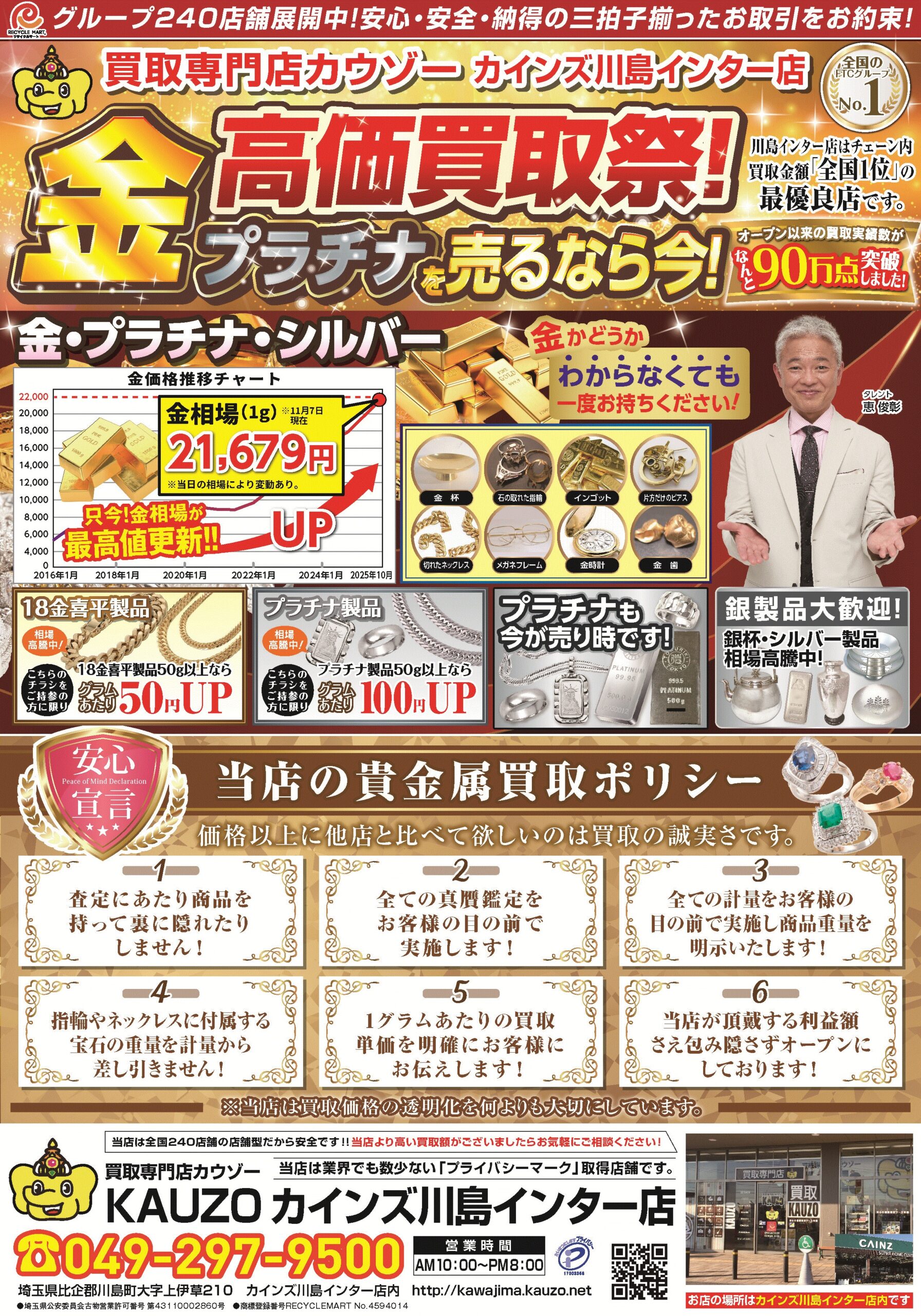 金 ・プラチナ、ダイヤモンド、ブランド品、ロレックス 、金券 を売るなら「買取専門店KAUZO カインズ川島インター 店」へ。
