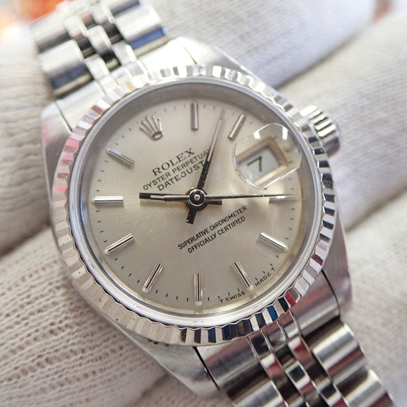 「ロレックス デイトジャスト 69174」は、1980~1990年代に製造されたレディースモデルで、ステンレススチールと18Kホワイトゴールドのコンビ仕様が特徴です。