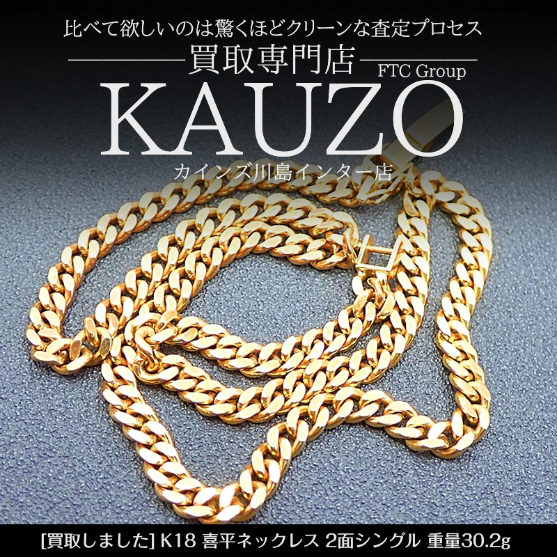 『 K18 喜平ネックレス 2面シングル 重量30.2g 』を買取させていただきました。