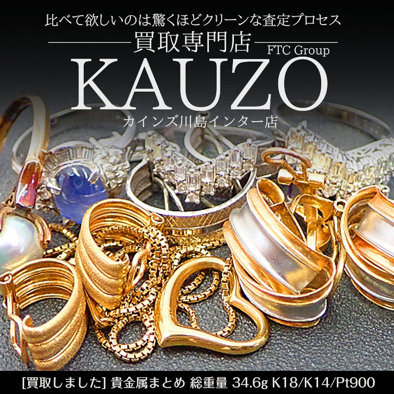 金 ・プラチナ、ダイヤモンド、ブランド品、ロレックス 、金券 を売るなら「買取専門店KAUZO カインズ川島インター 店」へ。