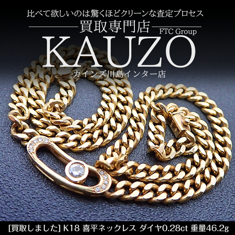 『 K18 喜平ネックレス 重量46.2g ダイヤ 0.28ct 』を買取させていただきました。