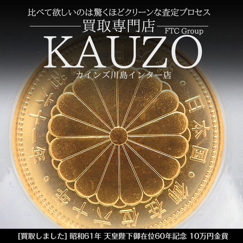 川越市のお客様より、昭和61年発行分10万円金貨を買取させていただきました。